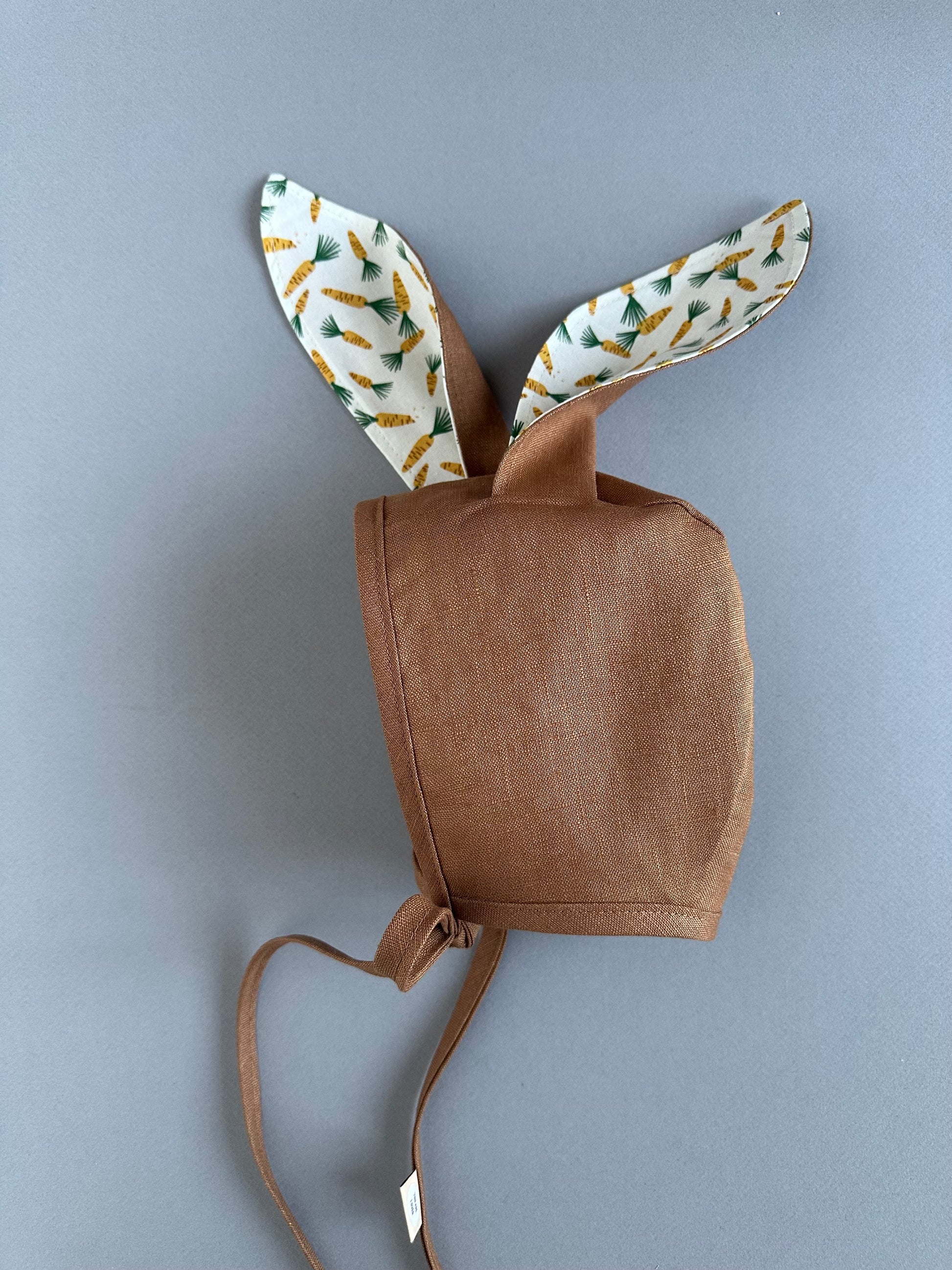 Made from a 100% linen, prewashed and so soft to the touch, this luxurious linen bonnet is the perfect topper for your wee bunny. Featuring cute peek a boo carrot print ears.