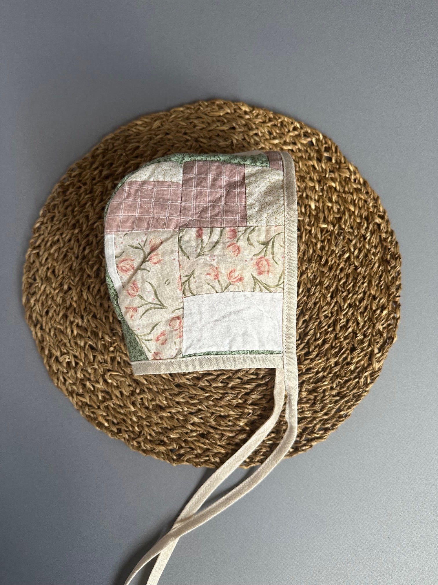 This bonnet is one of a kind and ready to ship. There may be some slight discolorations on parts of the exterior, however this is normal as the bonnet is upcycled from previously loved materials.