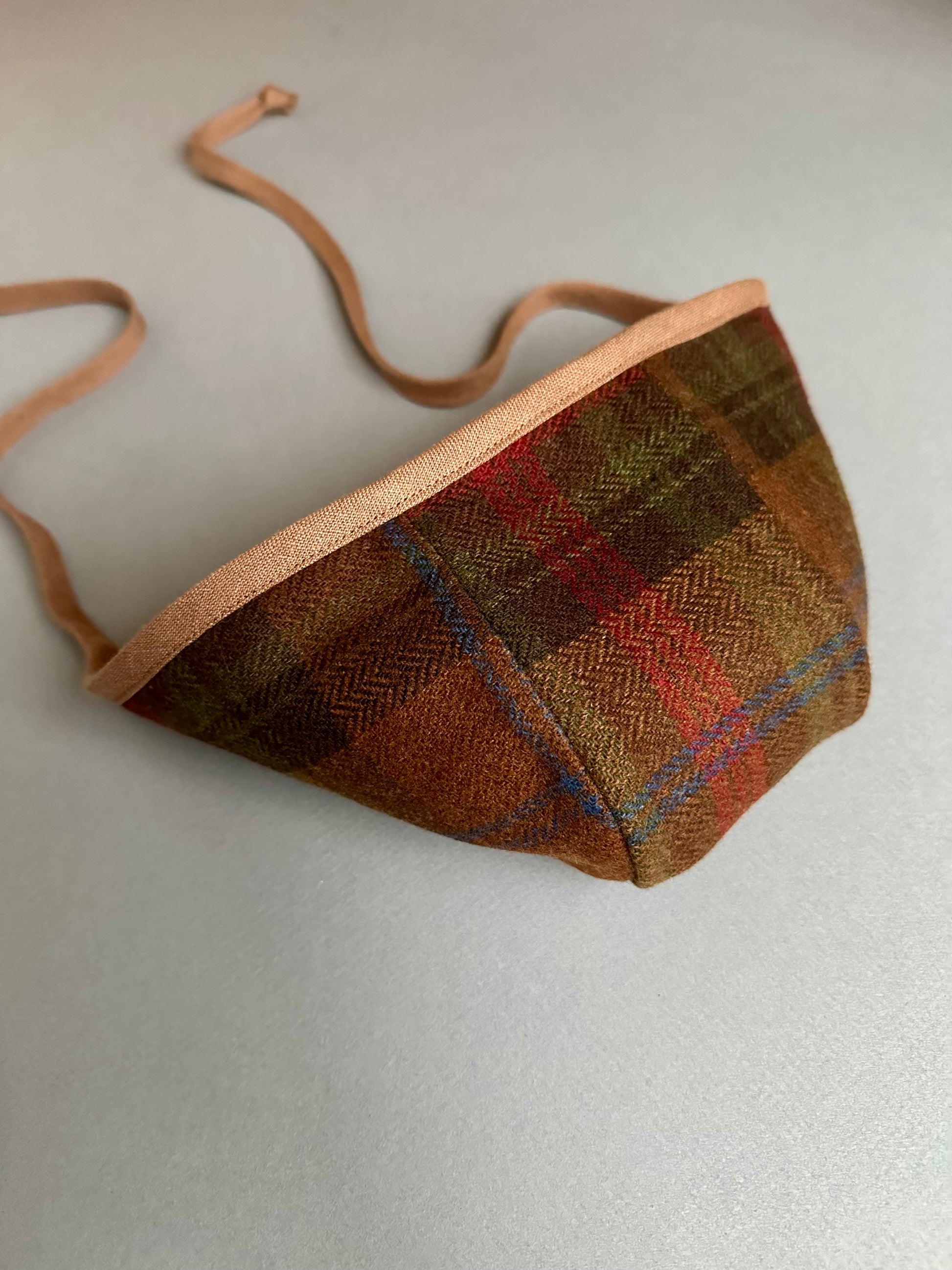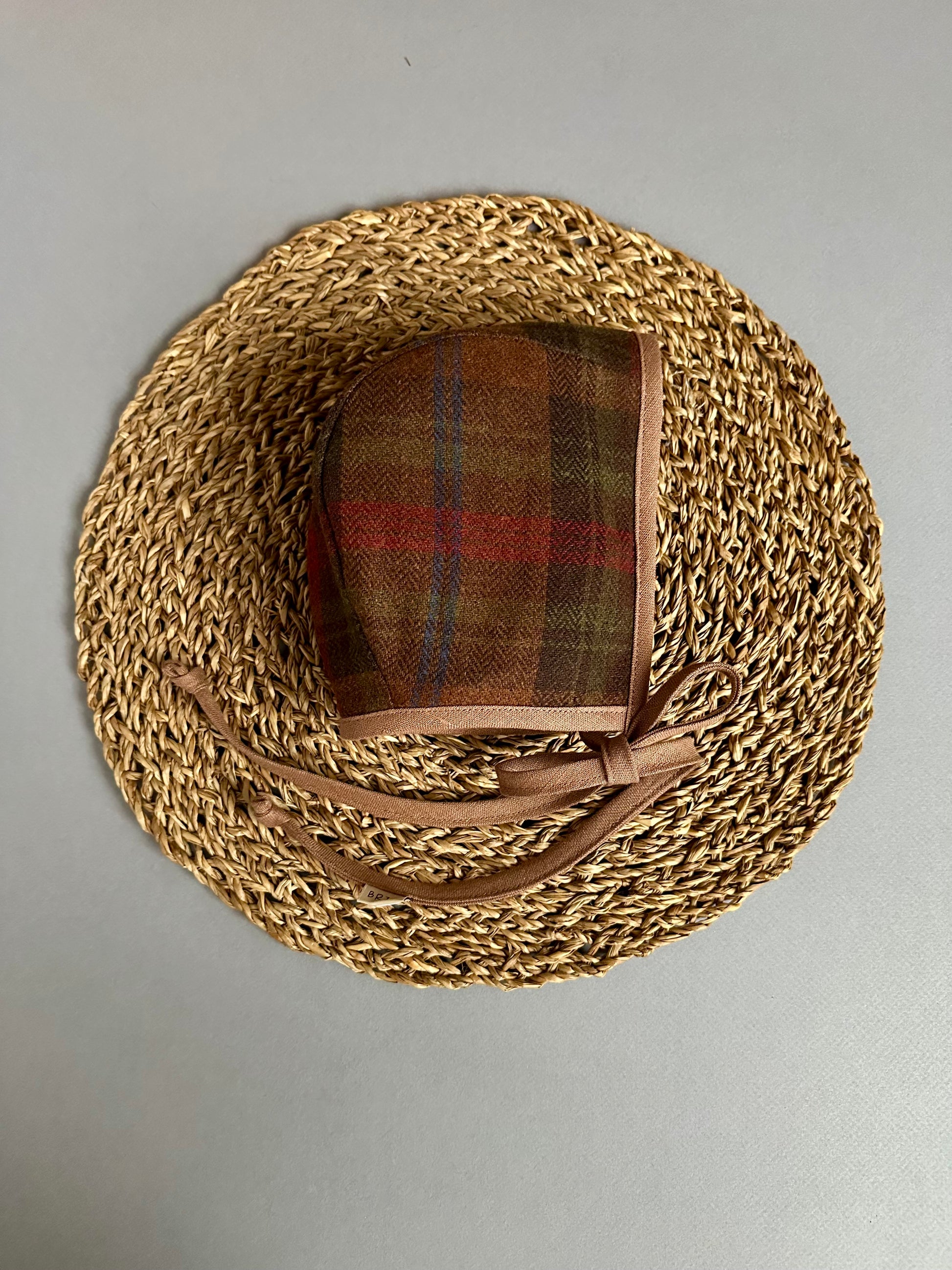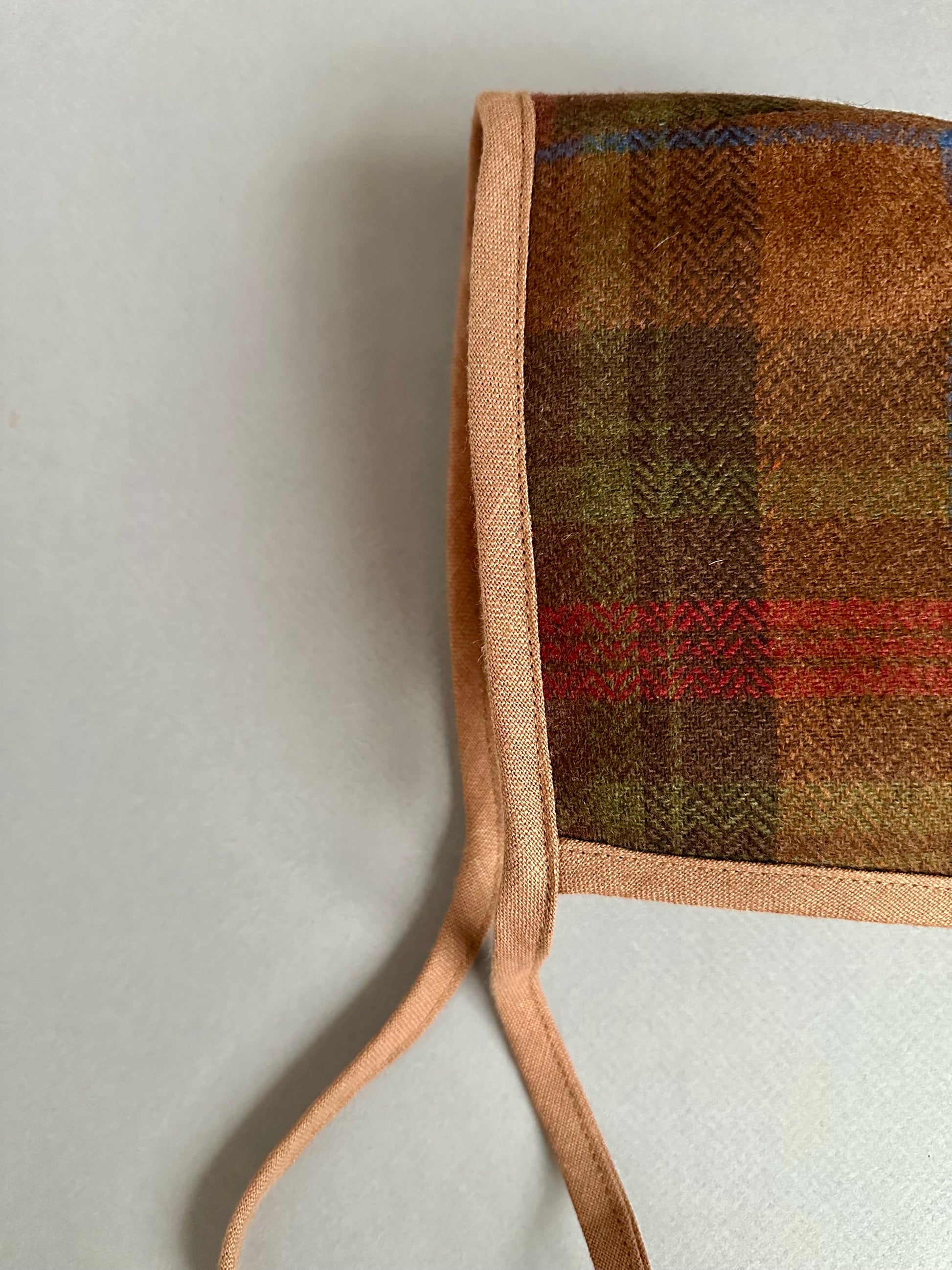This bonnet is made from a light weight wool that features a stunning plaid. Often used for winter coats, wool is a natural water repellent and insulator which makes it ideal for winter bonnets. Bonnet is lined with organic cotton sherpa for added warmth