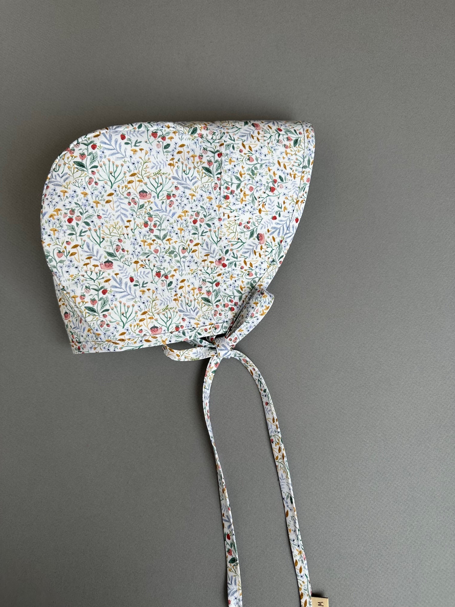 This listing is for a basic brimless bonnet made from 100% cotton featuring the cutest wee snails with strawberry shells, amongst a feild of vines and teeny mushrooms. Customize your bonnet by selecting your preferred lining or adding an Brim (extra charges may apply based on customization selected).