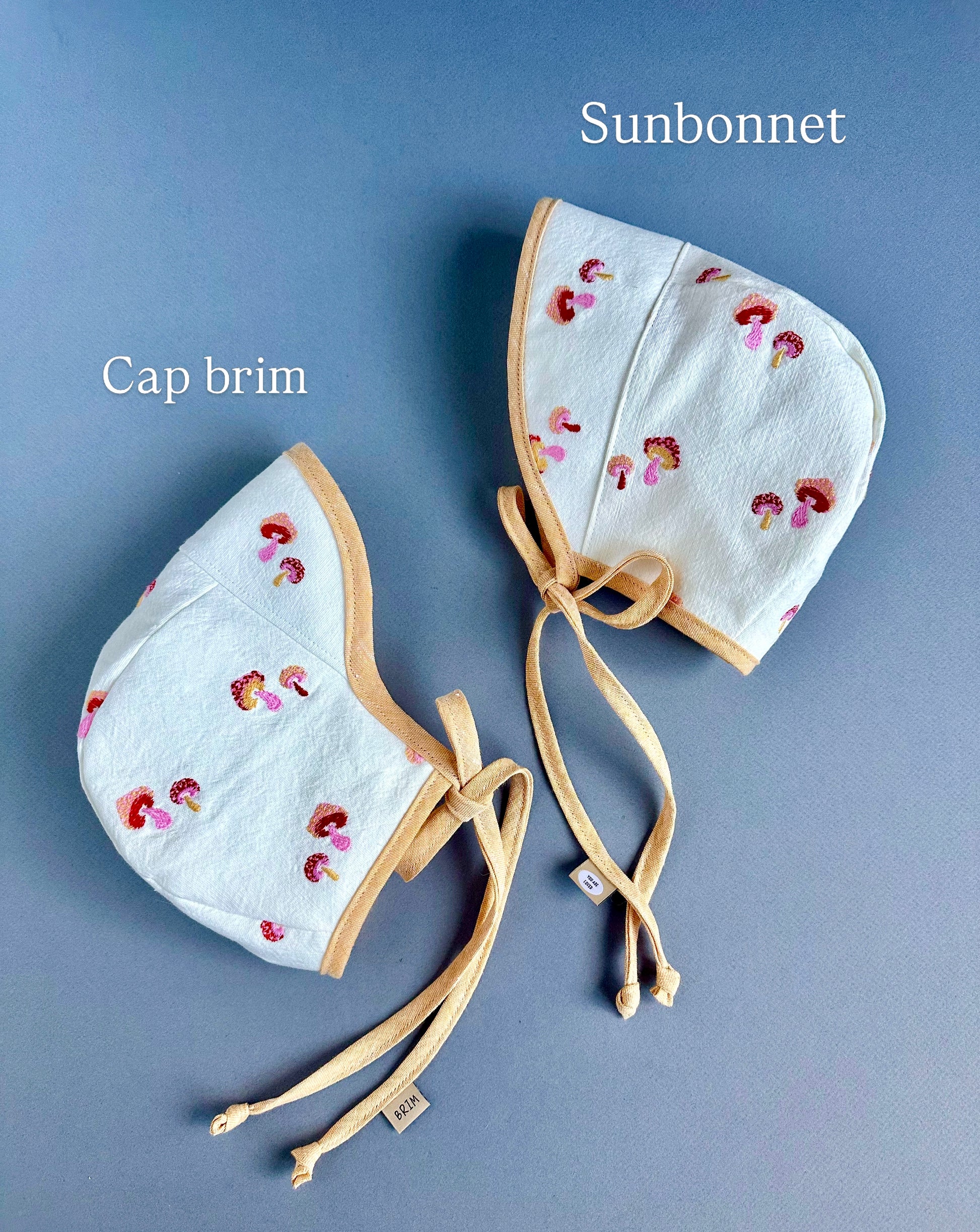 **Placement and number of mushrooms will vary on each bonnet depending on the size and style ordered. Thumbnail image is a size 12-18 brimless bonnet.
